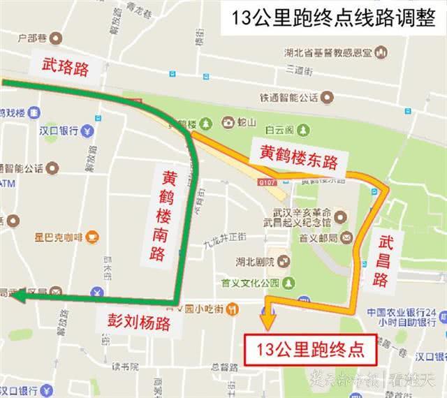 2、赛道部分调整。受占道施工、道路缩减影响,13公里跑临近终点区域线路,由黄鹤楼南路调整为黄鹤楼东路、武昌路,避免黄鹤楼南路下桥区域跑友过于集中。另外,临江大道在距离新河街路口10米处,增设了折返点。