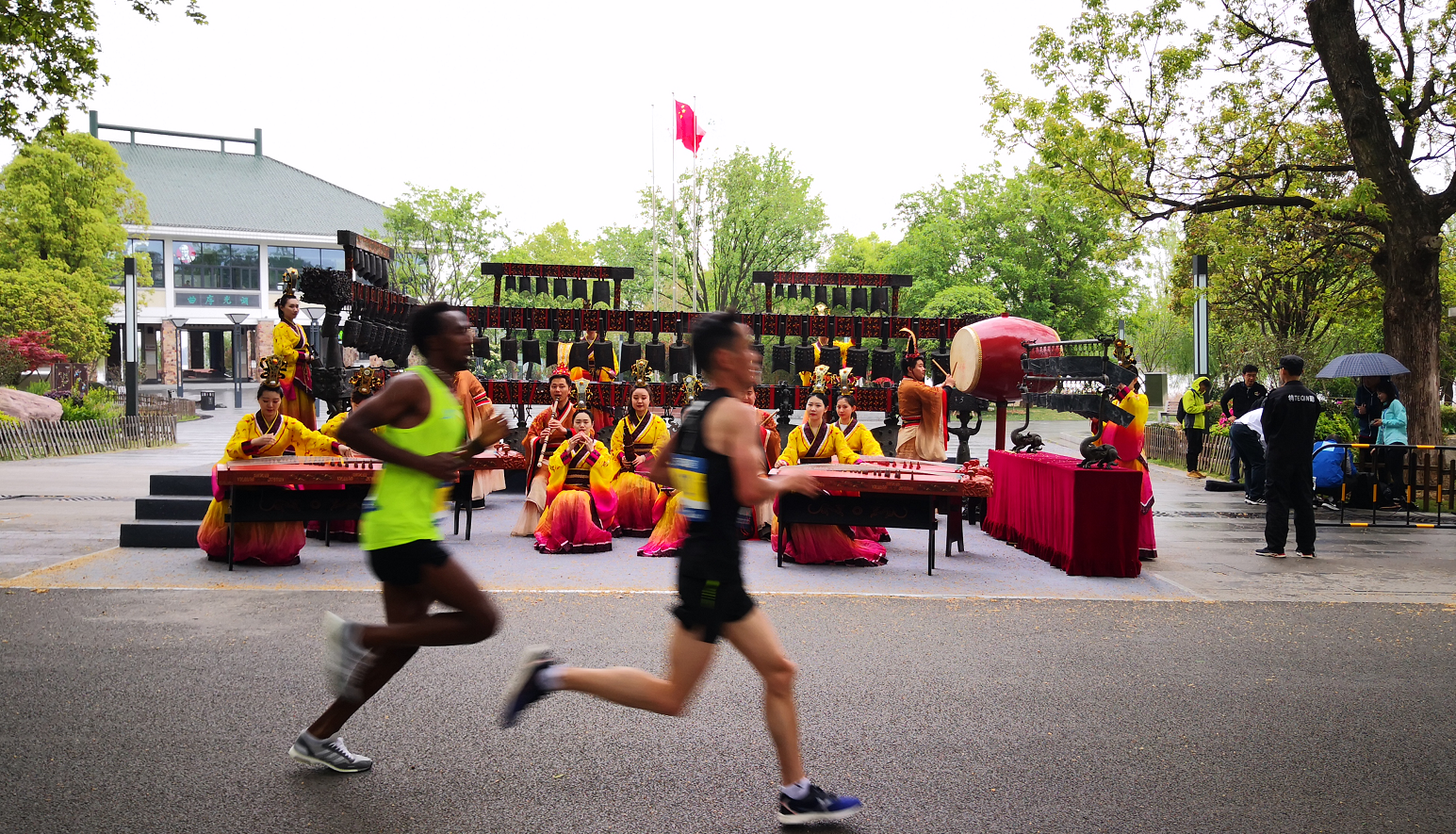编钟在汉马赛道36.4公里处(湖光序曲)的官方音乐加油站奏响