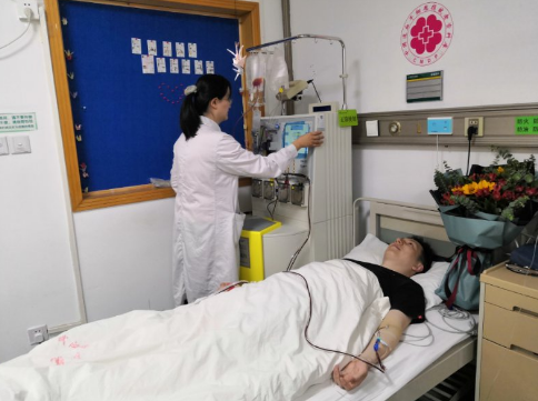 早上6点左右,程医生已在省红十字会骨髓库工作人员的陪伴下,再次注射动员剂,正式开始了造血干细胞。此时,程医生平静地躺在床上,看着鲜红的血液顺着洁白的输血管,一滴滴地缓缓流入血细胞分离机,成为一颗颗生命的种子。想到自己的血液即将注入另一位患者的体内,程医生脸上溢出阵阵幸福。