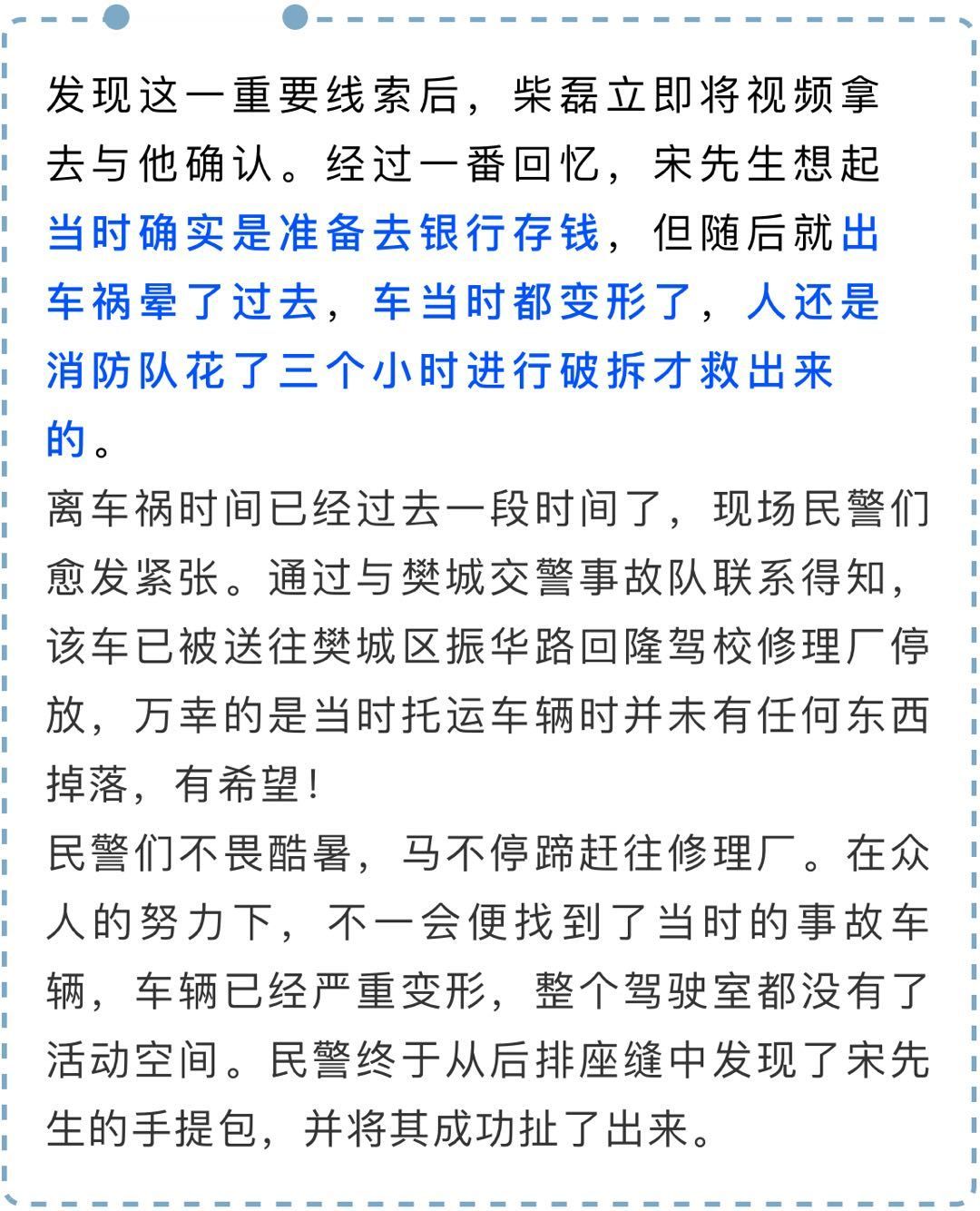 “2019年7月29日13时14分,樊城公安分局太平派出所接到宋先生打来的报警电话,称自己辛辛苦苦攒的10万元不见了,怀疑是被人偷了。值班民警柴磊接到报警电话后,立即带着同事赶往现场。民警对现场进行二次勘查后,仍没有发现手提包的踪迹。考虑到有内贼的可能,民警柴磊对宋先生一家进行逐一询问,最终也排除了他们动过这笔巨款的可能性。案件陷入僵局,为了找到突破口。民警柴磊让宋先生把这几天发生的事情,都事无巨细讲出来,终于一句话引起了柴磊的注意。”