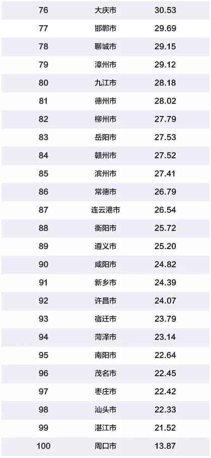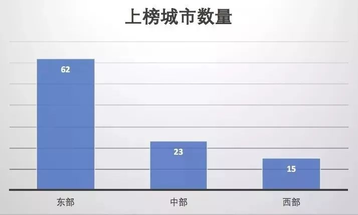 从数量上看,东部地区上榜城市62个,中部地区上榜23个,西部地区上榜15个,百强城市呈现出由东向西阶梯式格局。