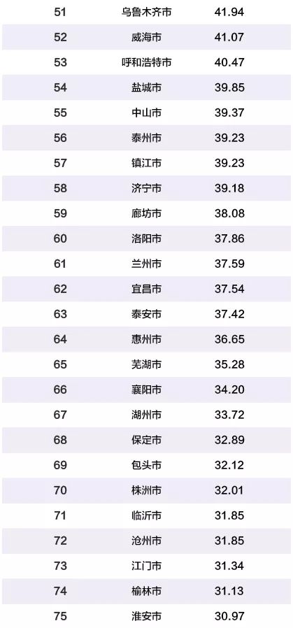 其他70分以上的城市涵盖了第七至第十位的成都(71.91分)、天津(71.78分)、武汉(70.91分)和南京(70.22分),这四个城市同样可以视为“准一线”城市,其得分不相上下,竞争激烈。