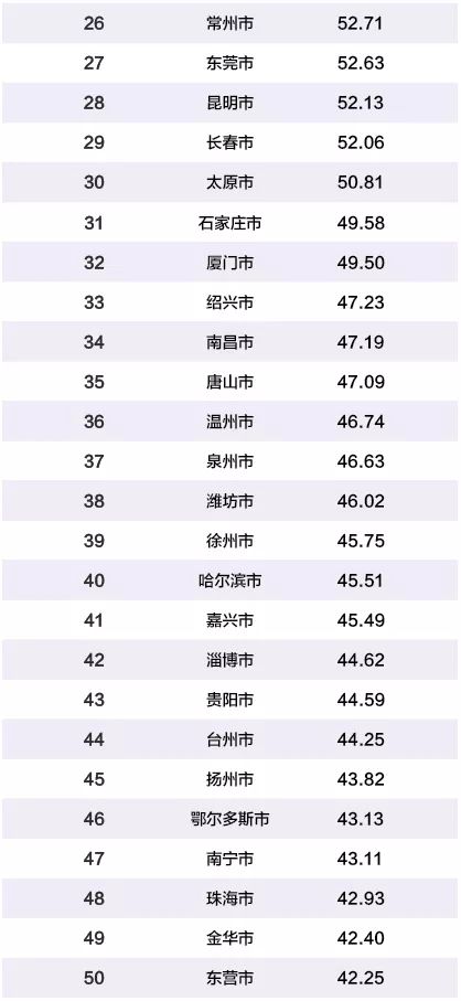 位于第五和第六的杭州(74.26分)和苏州(73.61分),可视为“准一线”城市(依据新一线城市研究所发布的2019年《城市商业魅力排行榜》)。杭州作为省会城市,拥有丰富和完善的科教、文化和医疗资源,软经济优势显著。