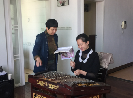 王小玉(左)正在陪女儿黄梦婕(右)练习扬琴