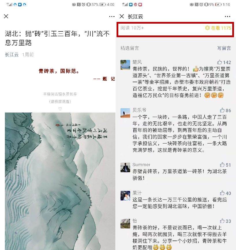 上可九天“揽月”,下可落地深耕。湖北卫视全国覆盖人口10.69亿,受众影响力、市场渗透力和广告号召力以华中为圆心深度辐射全国,实现名副其实的“空中传播”。湖北影视频道是湖北地面频道中的“实力悍将”,发挥其贴近生活、贴近受众和多年举办线下活动的优势,打造独树一帜的“TV+活动”动销品牌。湖北卫视与湖北影视“天地”携手,双核驱动,以强大的电视公信力为基础,以新媒体和线下活动为两翼,以观众群、粉丝群、朋友圈为跨圈层裂变渠道,构成了“电视屏+电脑屏+手机屏+户外屏”多屏共振的优质媒介组合,实现空中传播、地面生根、多屏共振、多元营销,为客户提供“上天入地”的一站式营销传播服务,真正实现融合、跨屏、出圈!11月1日,一篇由湖北卫视事业部出品的赤壁青砖茶新媒体产品——《抛“砖”引玉三百年 “川”流不息万里路》,在“长江云”微信公众号上线,推送当天阅读量就迅速窜上10万+,也让羊楼洞古镇和川字青砖茶瞬间引爆朋友圈!