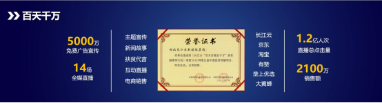 长江云大平台推出的“百天千万扶贫”大型融媒行动,不仅为湖北35个县免费提供价值5000万元的广告宣传,而且通过“主题宣传+新闻故事+扶贫代言+互动直播+电商销售”的新模式进行直播,14场直播总点击量1.2亿,农产品累计销售额超过2100万元。
