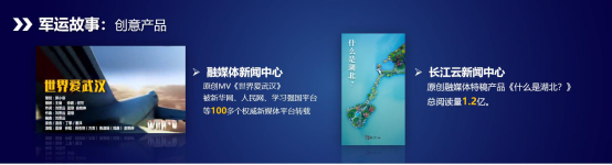 创意产品:融媒体新闻中心,原创MV《世界爱武汉》被新华网、人民网、学习强国平台等100多个权威新媒体平台转载。长江云原创融媒体特稿产品《什么是湖北?》总阅读量1.2亿。在主媒体新闻中心,奋战的十月,湖北广电融媒体倾全力让全世界听到了东道主最强势与最震撼的声音!