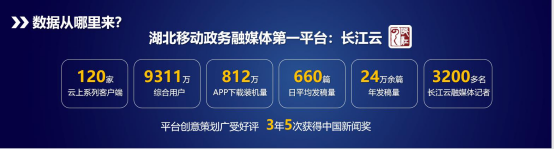 利用长江云平台大数据,可以实现重磅新闻整体策划:120个“云上”系列客户端同步策划与发布。全省力量联合报道:综合用户9311万,省市县三级全域覆盖。上接央媒下连县市:2019年联动央媒100多次,与市州发起互动直播470多场。精准推送霸屏传播:通过用户行为分析和画像,实施精准推送。