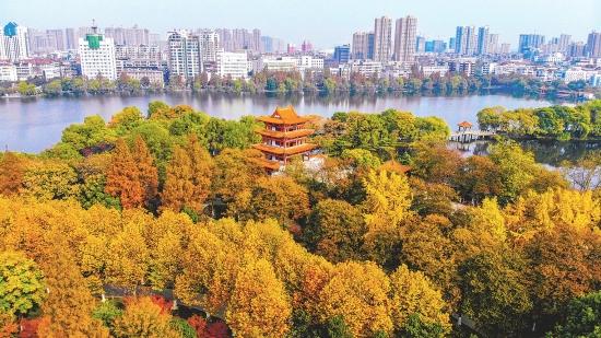 沙市中山公园层林尽染,让冬日的森林城市充满生机(无人机拍摄)。