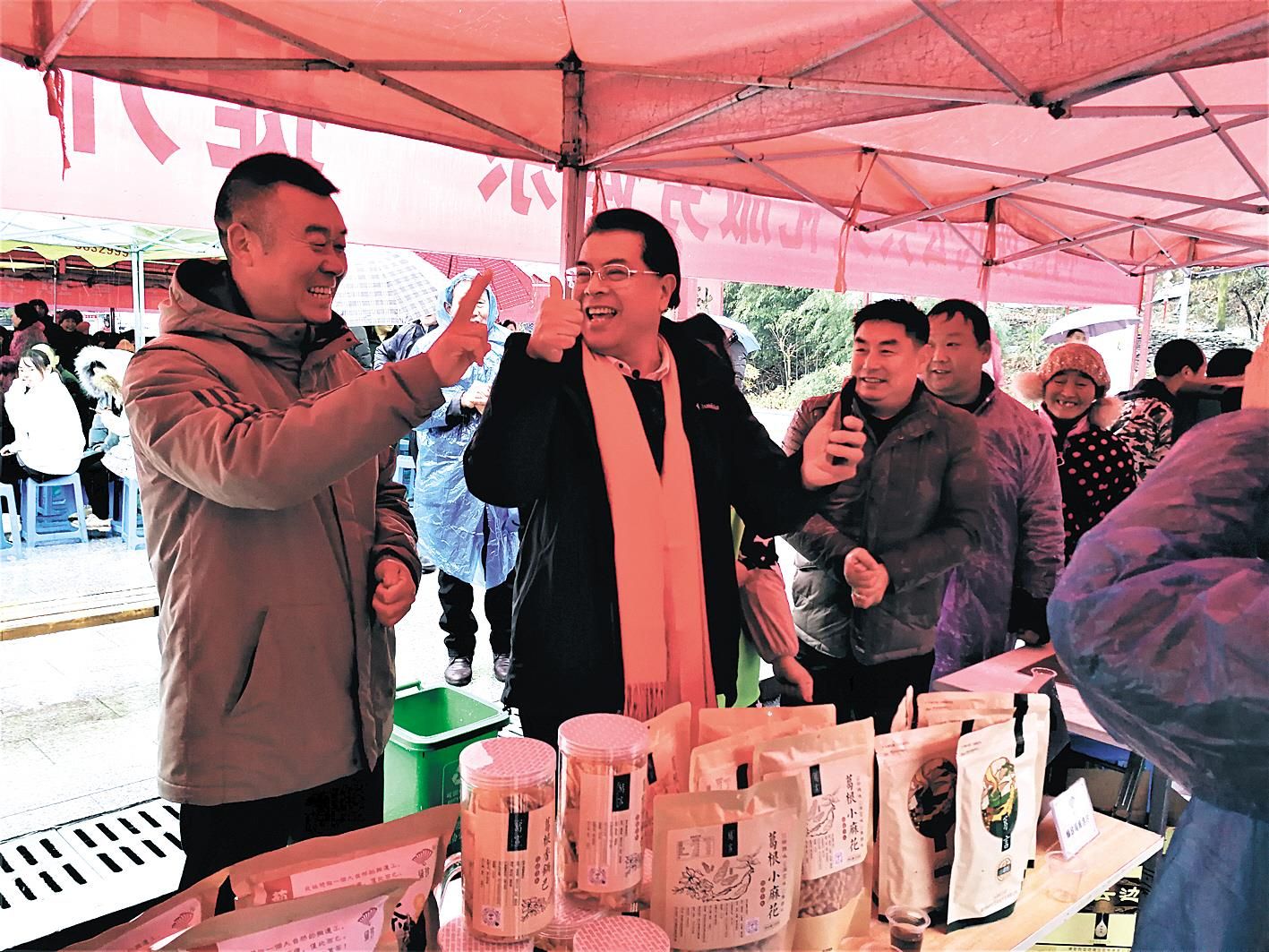 眼见集市大篷里山货琳琅满目,著名相声表演艺术家、国家一级演员陆鸣冒雨走进来,与付远存拉起家常。付远存一眼就认出了陆鸣,在电视里看见他上过央视春晚。除了付远存这一家,来赶集的村民不少,还有十几家乡村企业。陆鸣从摊点一一看过去,有核桃、香菌、木耳、葛根小麻花、葛根香锅巴、葛根脆片、蓝莓、蓝莓酒、核桃油,土特产品真不少。