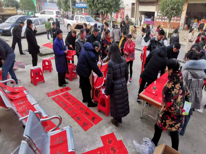 上午9时,在汀泗桥镇星星村党员群众服务中心前,荆楚"红色文艺轻骑兵"咸安区文旅局小分队文化助力精准扶贫活动刚刚开始,村民们一大早就挤在一起,饱含热情的书法家们挥毫泼墨,将真诚的祝福赋诸笔端,笔尖上尽显年味浓浓、情意浓浓。一幅幅书法佳作跃然纸上,很多村民现场纷纷求墨宝。红色的春联和热闹的人群将活动现场映衬得年味十足。