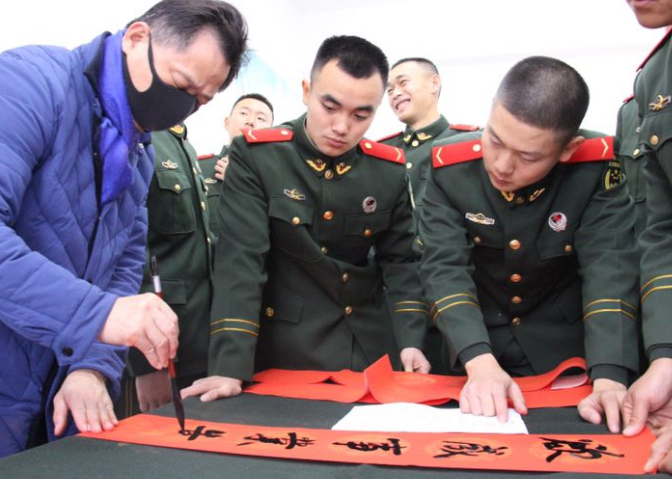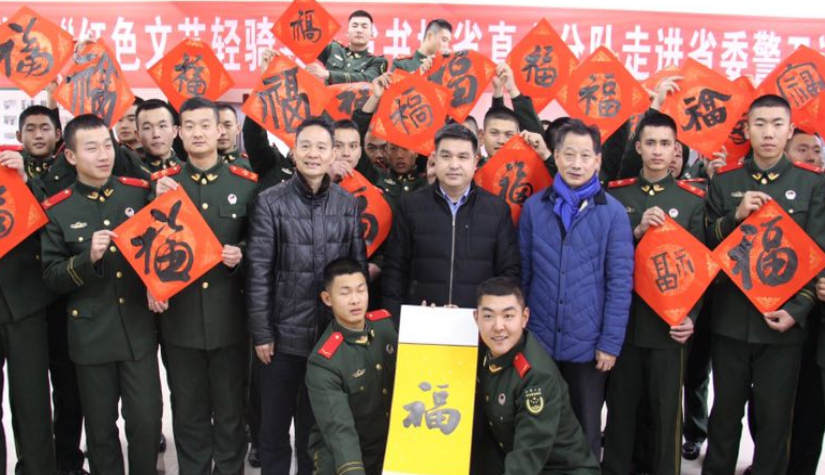 2020年元月22日,时值农历腊月二十八,离春节的脚步越来越近了,武昌街头年味浓,受新型冠状病毒疫情的影响路面行人渐少。在新春佳节即将到来之际,荆楚“红色文艺轻骑兵”省书协省直小分队走进省委警卫连写春联送祝福活动如期举行。湖北省书协省直分会副会长兼秘书长郭永安,副秘书长王敏、周大春等人应邀前往省委大院警卫连驻地,现场为执勤站岗的武警官兵书写春联、福字,送上新春美好祝愿。
