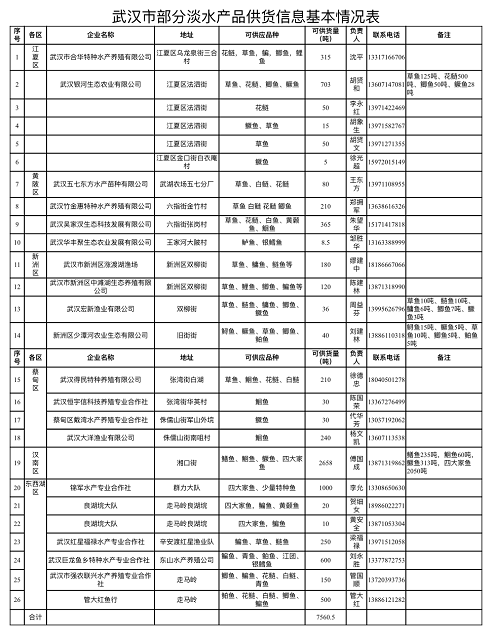 为做好当前新冠肺炎疫情防控期间的水产品保供,武汉市农业农村局向社会发布部分淡水产品供货信息,涉及江夏、黄陂、新洲、蔡甸、汉南和东西湖6个区26家水产养殖企业、专业合作社、养殖大户等,总计可供货7560.5吨,包括草鱼、鲢鱼、鳙鱼、鲫鱼、鳜鱼等品种。