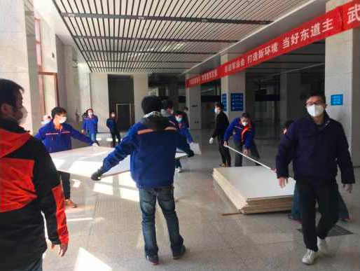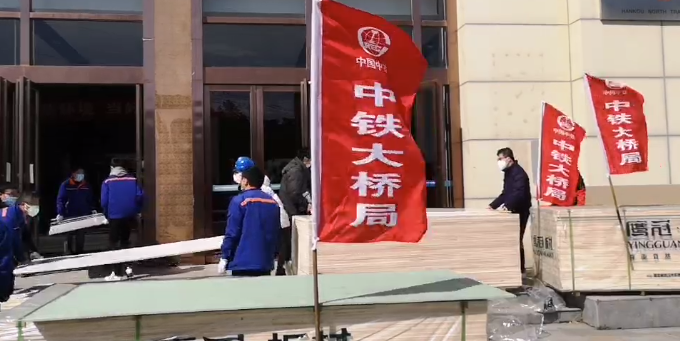 2月17日中午,随着一批批防疫物资、物料设备陆续进场,由中铁大桥局参与建设的汉口北“方舱医院”正式开建。在短短半天时间组织起来的550名施工人员正在现场进行紧张的卸运物资工作。