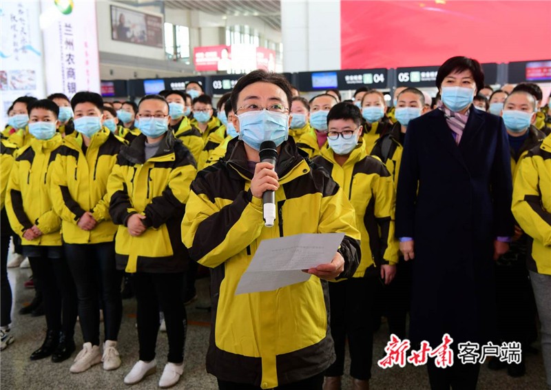 出征仪式上,甘肃省第六批援助湖北医疗队队长、兰大一院主任医师刘晓菊代表全体队员作表态发言。她说,我们172名队员能够代表甘肃驰援湖北,深感自豪,也深知责任重大。疫情面前,医务人员就是战士。为了祖国的安宁、人民的安康我们义无反顾。到达湖北后,我们一定服从当地统一领导和指挥,第一时间成立临时党支部,发挥我省在救治患者方面的成功经验,秉持“大爱无疆、救死扶伤”的精神,全力以赴投入到湖北疫情防控第一线,不负全省人民期望,圆满完成组织交付的任务。
