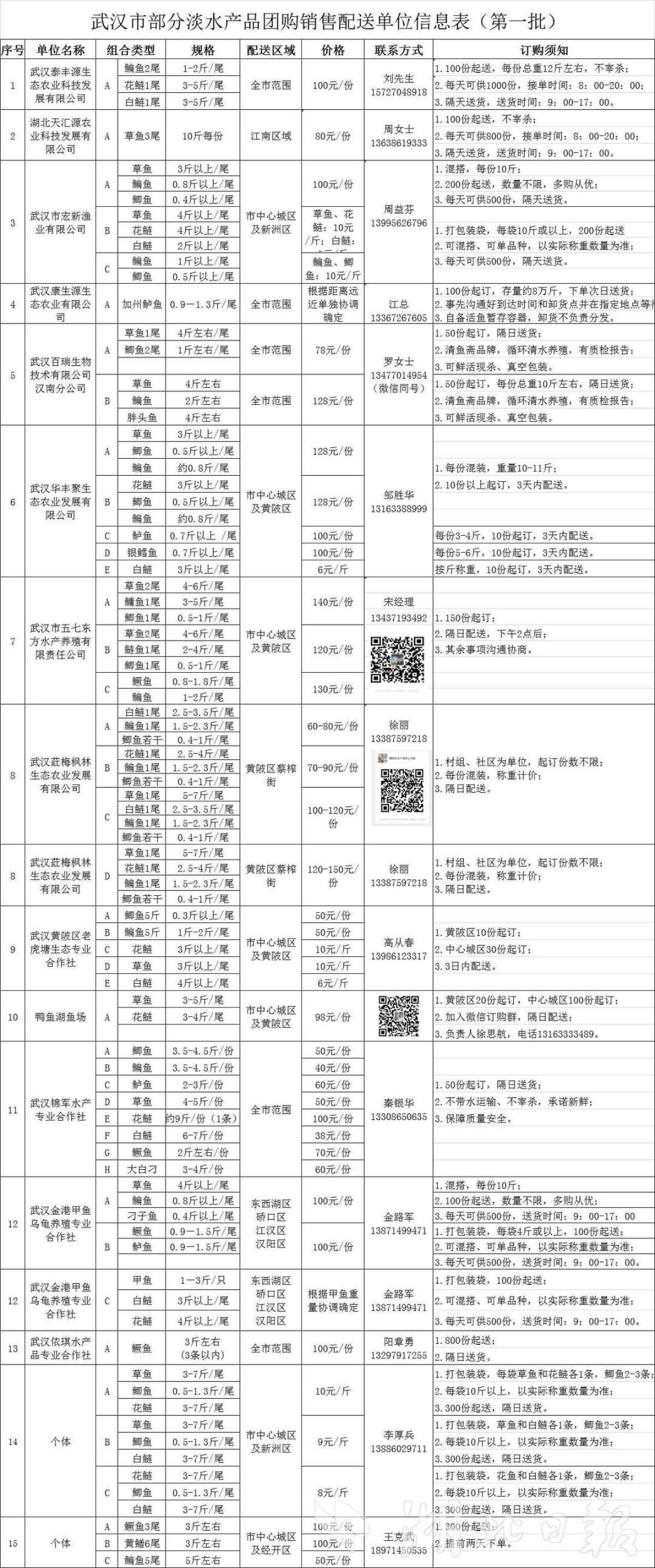 2月24日,武汉市农业农村局向社会发布第一批淡水产品团购销售配送单位信息,涉及15家养殖公司、合作社和养殖大户,包括四大家鱼等品种,参与销售配送的单位都签订了诚信承诺书。此举旨在做好当前新冠肺炎疫情防控期间水产品保供工作,大力推动水产品团购配送进社区、进单位模式。