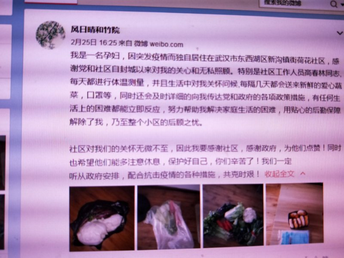 我是一名孕妇,因突发疫情而独自居住在武汉市东西湖区新沟镇街荷花社区,感谢党和社区自封城以来对我的关心和无私照顾。特别是社区工作人员高春玲同志,每天都进行体温测量,并且生活中对我关怀问候,每隔几天都会送来新鲜的爱心蔬菜,口罩等,同时还会及时详细地向我传达党和政府的各项政策措施,有任何生活上的困难都能立即反应,努力帮助我解决家庭生活的困难,用贴心的后勒保障解除了我、乃至整个小区的后顾之忧。