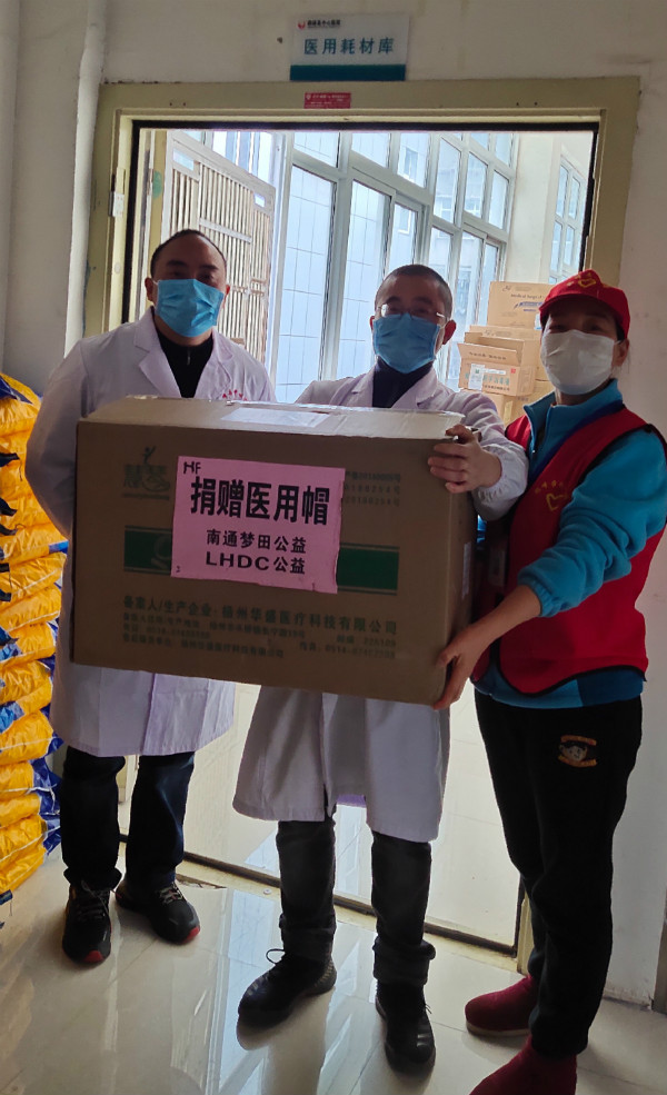 江苏省南通市梦田公益连心社、LHDC公益已先后两次向鹤峰县中心医院捐赠爱心医疗物资,此次捐赠的物资是一次性医用帽子2500个。