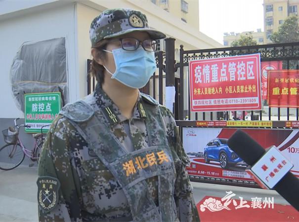襄州区张湾街道办事处铁四院社区女民兵 周娟娟:“我以党员的标准严格要求自己,每天照顾好小区内的高龄老人,为他们送药送菜,在疫情期间,全力保障他们的生活,确保他们能舒心健康的生活。”(记者:任伟)