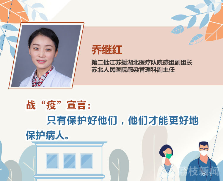 2月1日上午,第二批江苏援鄂医疗队成立14人的党员突击队,进入武汉江夏区第一人民医院三个病区开展临床救治。乔继红是突击队中的一员。面对完全陌生并且充满未知危险的病区,她立刻制定了从驻地到院区,以及从院区返回的院感防控制度,让医护人员有据可依。“排除隐患,制定院感防控制度,都有明确的工作流程,这样可以让大家心里更踏实,有信心一定能够战胜疫情,做到零感染。”在乔继红看来,保证队友百分百安全就是自己此行武汉的最大职责。