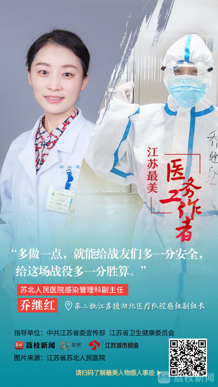 为了支援湖北抗击疫情,江苏医疗队的白衣战士们慷慨以赴、日夜奋战,为打赢湖北保卫战贡献了江苏 “硬核力量”,彰显了有情有义的“江苏担当”。他们是这场战斗中的英雄,是我们最可亲可敬可爱的人。3月10日,中共江苏省委宣传部、江苏省卫生健康委员会通过信息云技术,联合发布第五批在战“疫”斗争中涌现出来的先进典型事迹。让我们一起走近这些奋战在防疫前线的“最美医务工作者”,倾听他们的战“疫”故事。
