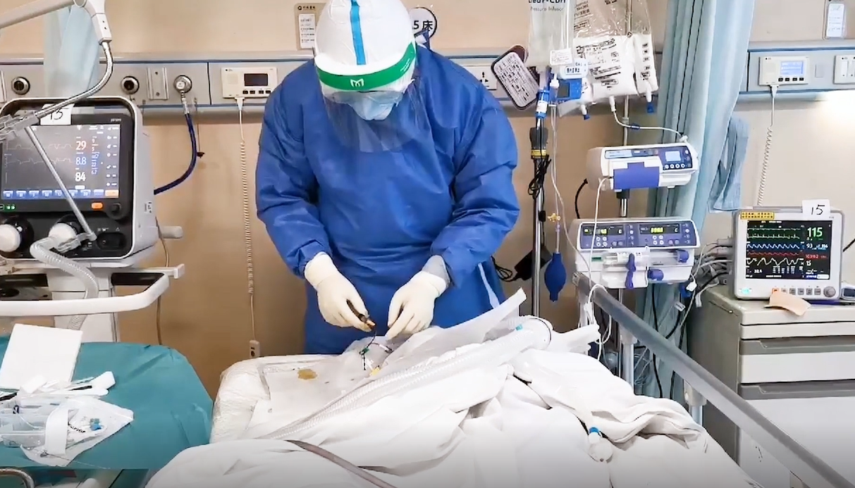 周路阳到达武汉的第14天,病区收治了接管以来最为危重的一位病人:病人入院时带着插管,多脏器功能衰竭,血氧饱和度只有70%,血压最低53/26mmHg。医生们经过紧急讨论,一致认为应立即对该患者进行床旁血滤,来维持其机体酸碱平衡,清除血液中的有害物质。