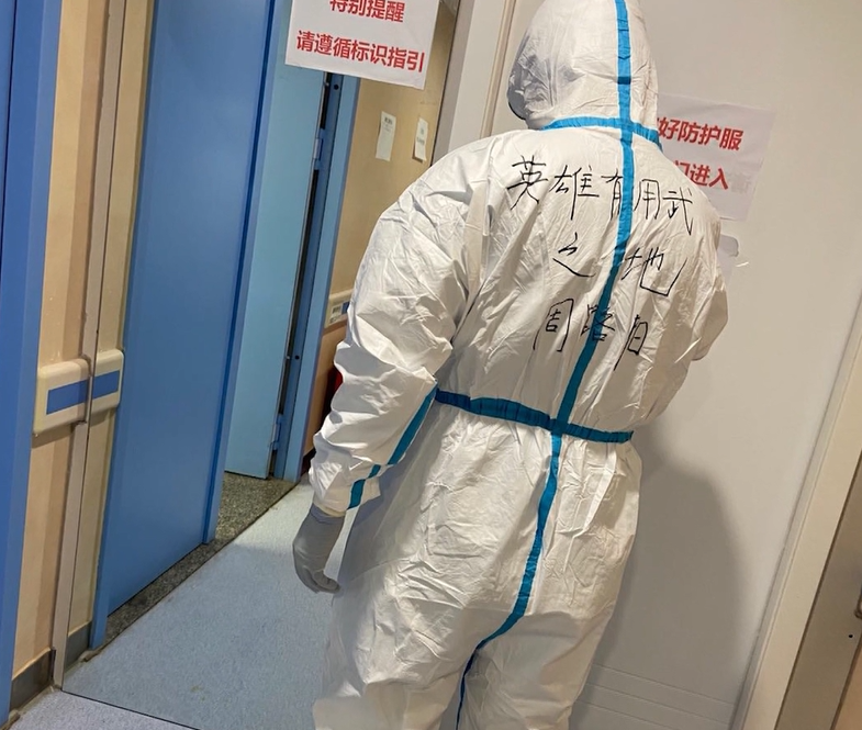 周路阳进入病房前 同事在他的防护服上写下了“英雄有用武之地”几个字