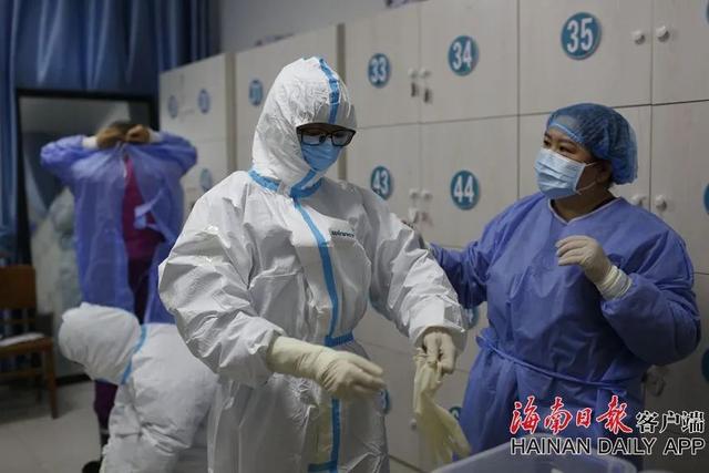 2020年2月21日,在湖北省洪湖市第四人民医院,医护人员在穿隔离服。海南日报记者袁琛 摄