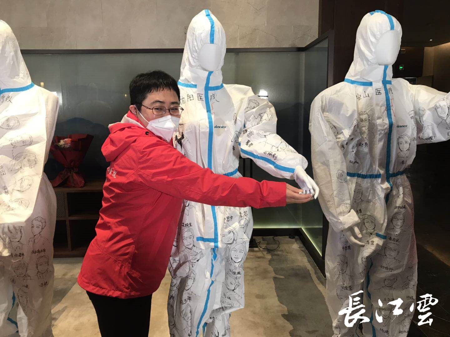 原来,防护服上绘满了215名医疗队员的卡通漫画形象,一个个可爱的战士形象让防护服看上去俨然如一件件白色“战袍”。