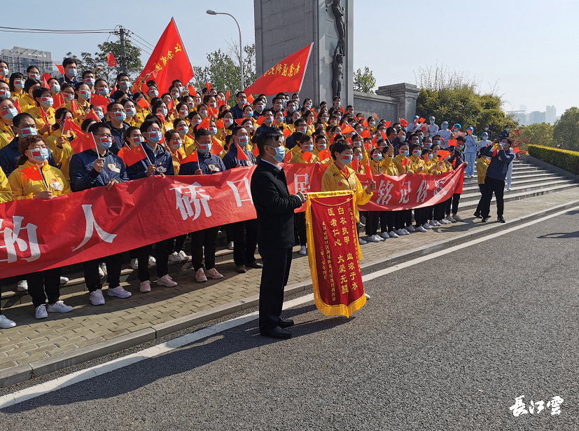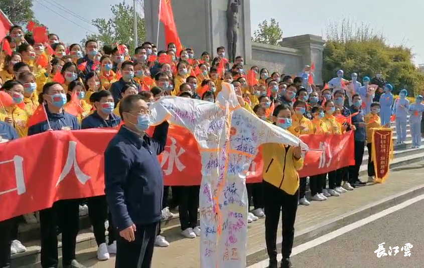 今天(4月12日)上午,在武汉江汉湾体育公园,硚口区政府、武汉市金银潭医院以及武汉市第一医院为江苏省人民医院举办隆重的欢送仪式。硚口区政协主席周付民为医疗队赠送书法作品“医者仁心”,江苏省人民医院回赠给硚口区人民政府的礼物是一件特殊的“战袍”——签满医护人员名字的防护服。