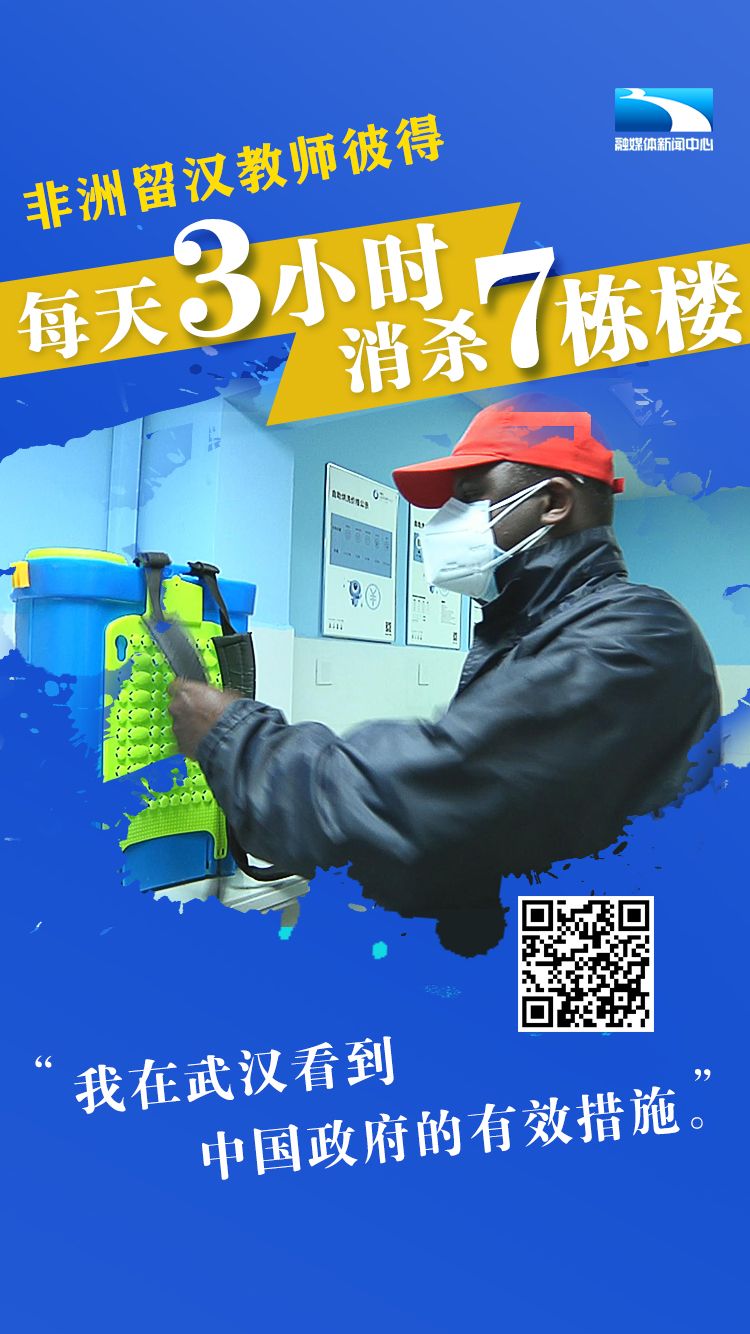 彼得是一位来自非洲喀麦隆的青年教师。在湖北工业大学留学4年后,留校担任了外籍教师。疫情发生后,他一个人就负责了7栋留学生公寓的消杀工作,只要是力所能及的事情,他都会搭把手。他说,在学校“抗疫”,也能把中国成功经验,传递到非洲大陆。