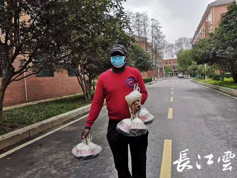 疫情期间,湖北工业大学还有近300名留学生住校。为了减少风险,彼得一个人就承担了公寓公共区域的消杀。对于他强壮的体格来说,一次全面消杀,往往都汗流夹背。除了消杀工作,彼得两个多月来,还为留学生取快递,拿外卖……留校的师生和保安都认得了这位热心快肠的非洲小伙。彼得说,他30岁毅然到中国来留学,是因为受到了生活在喀麦隆的中国人影响。