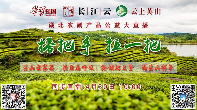 助力消费扶贫,爱心助农直播。为解决疫情影响下湖北地区农产品待销问题,“学习强国”学习平台联合湖北广播电视台、湖北省农业农村厅发起“搭把手、拉一把”农副产品公益直播活动。4月30日10:00,走进湖北省黄冈市英山县,推介英山云雾茶。您只需打开“学习强国”APP推荐频道或“直播中国”频道、长江云直播栏目、云上英山直播栏目就能实时收看。