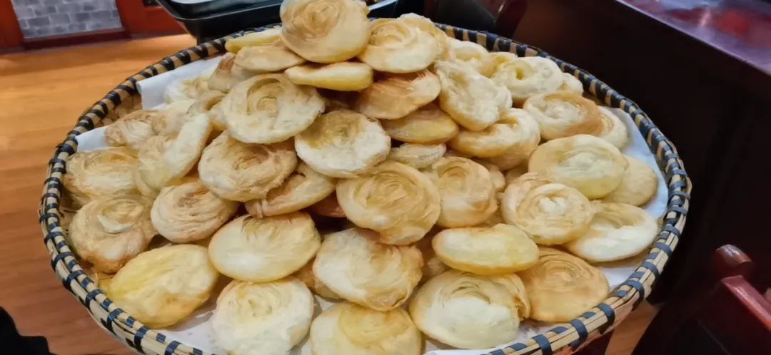 东坡饼是黄州地方风味名点,距今有九百多年的历史。相传为苏东坡设计,由安国寺大和尚参寥试制成功。制作方法:这是一种“千层饼”,系用上等细面粉做成蟠龙状,用麻油煎炸,片片如薄丝条,然后撒上雪花白糖。特色:具有酥、香、脆、甜的特点。后人为了纪念苏东坡,遂将此饼叫做东坡饼。当地人一般用来招待远道来的贵宾,也有的逢年过节作为馈赠礼品。