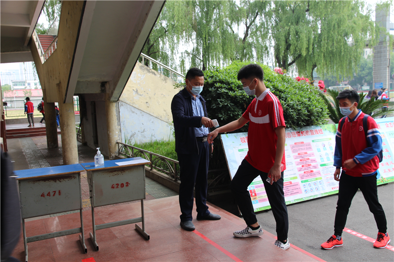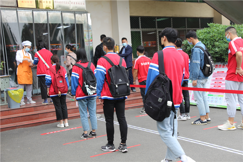 襄阳二十四中学校学生以年级为单位,实行错时错峰就餐,学生就餐进入食堂前,需要经过洗手消毒、体温测量等流程,取餐窗口也设置了1米隔离线,要求学生控制好间隔距离。