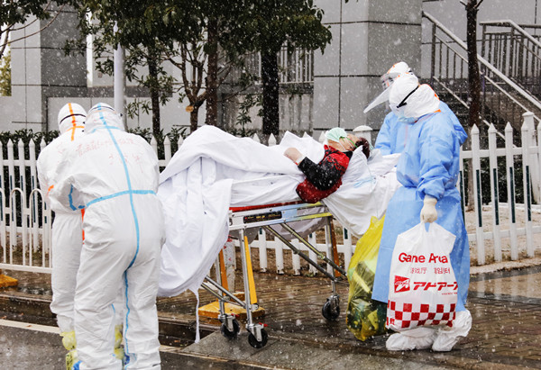2月15日下午,湖北省武汉市风雪交加。中国红十字会救护转运车队青海队在华中科技大学同济医院中法新城院区转运患者。(付春来)