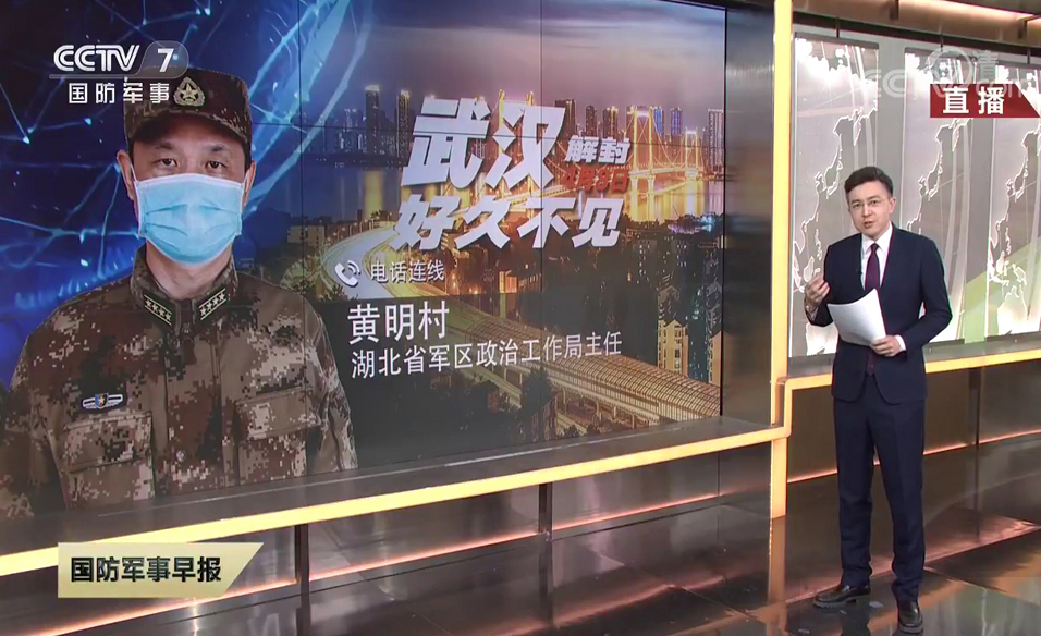 4月8日,武汉“解封”,中央电视台与湖北省军区政治工作局主任黄明村电话连线
