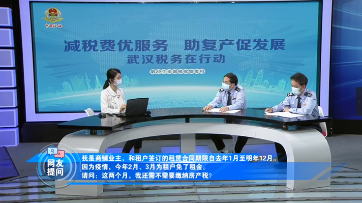 5月是第29个全国税收宣传月,14日,长江云邀请国家税务总局武汉市税务局党委副书记、副局长肖才茂,以及该局货物和劳务税处处长蒋国雄、个人所得税处处长张莉、财产和行为税处副处长喻宏斌做客长江云直播间,为网友朋友们解答了一系列疫情中税费减免的问题。