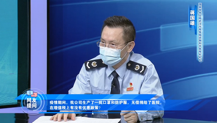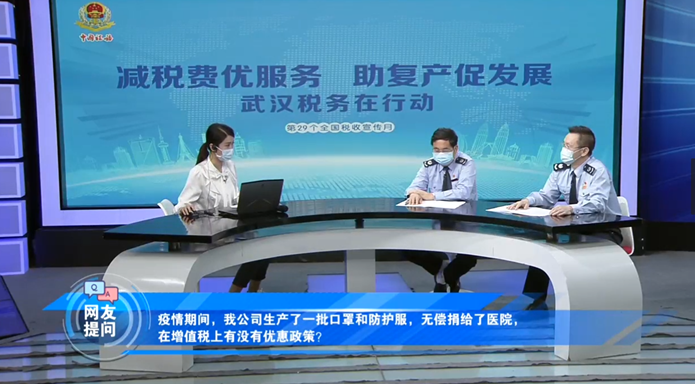 主持人:【C网友】提问:疫情期间,我公司生产了一批口罩和防护服,无偿捐给了医院,在增值税上有没有优惠政策?