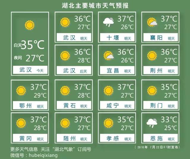 预计未来三天,除神农架、恩施西部以外,我省大部地区日最高气温将达35℃以上,其中十堰、宜昌、咸宁部分地区将达37℃以上,请注意防范!