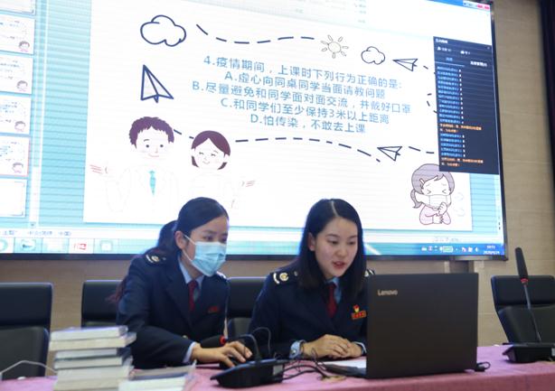 课堂上,晃银萍、彭放身着税服,化身网络主播向孩子们生动讲述我国的税收发展历史,结合日常生产生活实例,特别是这次疫情讲述税收对经济社会发展的重大意义,与孩子们探讨“我们能为税收做些什么”,并介绍了防疫小知识。