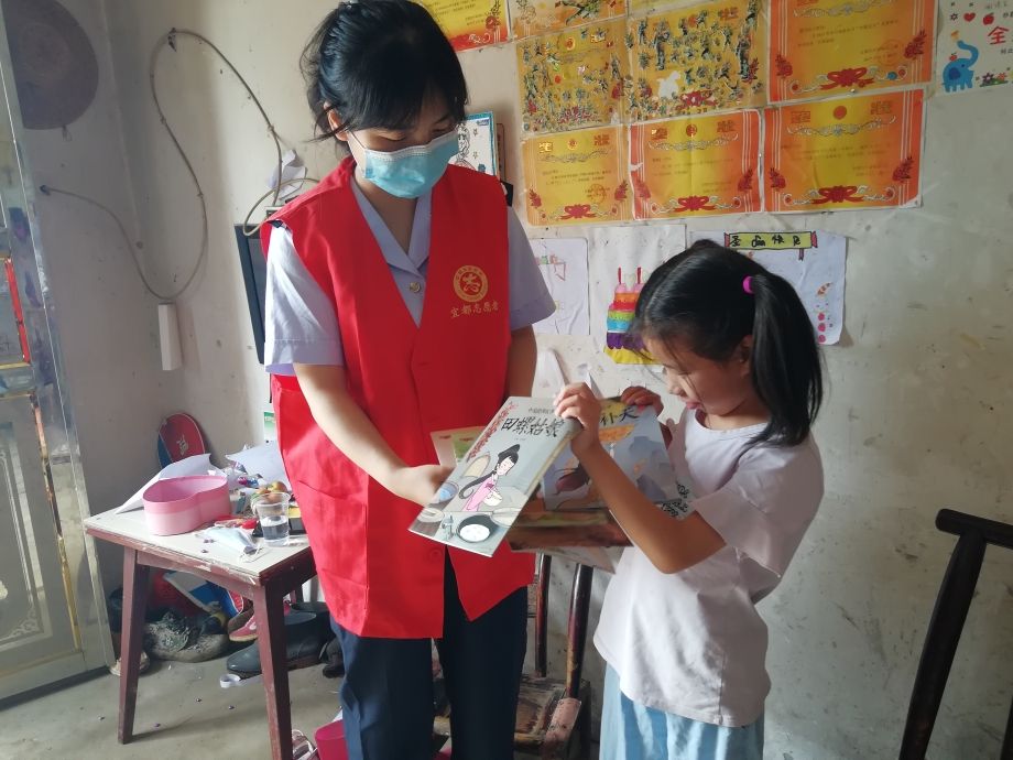 图为宜都市税务局志愿者田洁明为谢锦宜小朋友送去课外书籍。