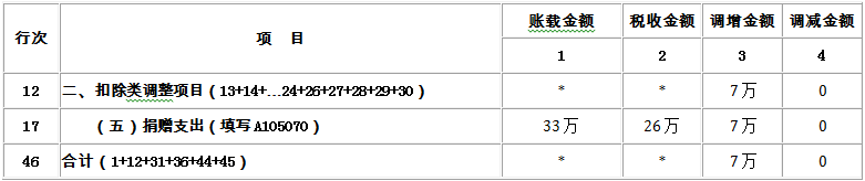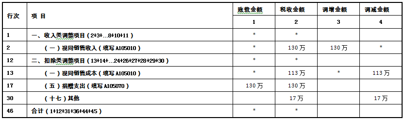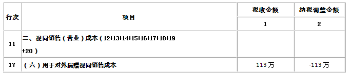 对纳税人这项捐赠业务,会计处理上按照实际支出113万元确认,税收上允许按照公允价值130万元进行税前扣除,由此形成的17万元税会差异,通过填报《纳税调整项目明细表(A105000)》第30行”(十七)其他”进行调整,纳税调减17万元。同时,该表也汇总反映了视同销售纳税调整的结果。