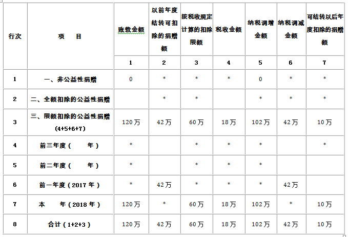 《公告》下发后,该企业通过更正2018年度纳税申报追溯享受政策,对于2017年度结转到2018年度扣除的42万元公益性捐赠支出,在2018年度的公益性捐赠扣除限额60万元内,可以扣除,填写在《捐赠支出及纳税调整明细表》(A105070)“纳税调减金额”栏次42万元;2018年的公益性捐赠税前扣除限额还有18万元,则2018年发生公益性捐赠120万元中有102万元不能税前扣除金额,填写在《捐赠支出及纳税调整明细表》(A105070)“纳税调增金额”栏次102万元。对于2018年发生的其他公益性捐赠70万元,有60万元在扣除限额内,超过扣除限额的10万元需结转以后年度扣除。