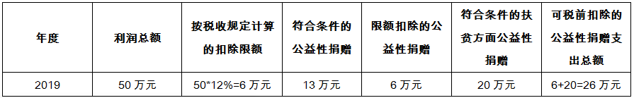 2019年度该企业的公益性捐赠支出税前扣除限额为6万元(50×12%),教育捐赠支出13万元大于扣除限额,需按限额扣除,并进行纳税调增7万元,该笔税款可结转以后三个年度扣除;扶贫捐赠无须考虑税前扣除限额,准予全额税前据实扣除20万元;合计可税前扣除的公益性捐赠支出总额为26万元。