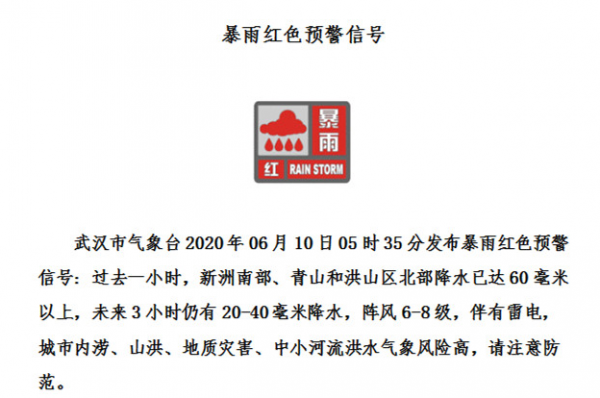 继9日晚连发两个暴雨红色预警信号后,武汉市气象台10日5时35分又发布暴雨红色预警信号:过去一小时,新洲南部、青山和洪山区北部降水已达60毫米以上,未来3小时仍有20-40毫米降水,阵风6-8级,伴有雷电,城市内涝、山洪、地质灾害、中小河流洪水气象风险高,请注意防范。