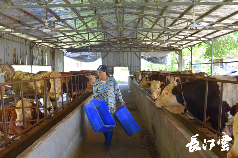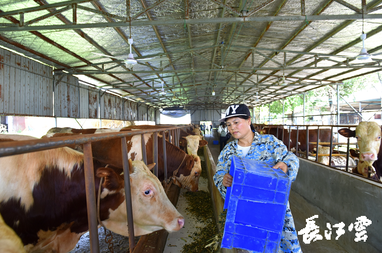 6月18日,在荆州区马山镇梅花湾村二组一家养殖场里,村民刘在梅正在自家牛舍忙着清扫牛槽、投喂草料。今年50岁的刘在梅原本是村里建档立卡贫困户,早年丈夫因意外去世,上有老下有小的她只能外出山东打工养家糊口。但是身处异地又无一技之长,2016年她选择回家,向亲朋好友借了30多万元,在村里和扶贫工作组的帮助下开始尝试养牛。从最开始的分期分批小规模养殖到如今近百头的养殖规模,刘在梅不仅顺利脱贫,日子也越过越红火。