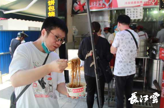 “应该没有武汉人不喜欢吃热干面吧。”上午10点,武昌粮道街的赵师傅油饼包烧麦门前早已排起了队。武汉人任喆和他的朋友,点了热干面和包烧麦,就在店外的小凳上吃了起来。周边,还有不少食客,捧着热干面,或是站着吃,或是蹲着吃……