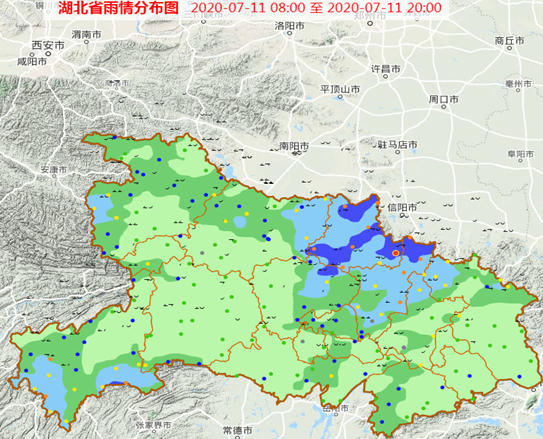 7月12~13日,雨带位于鄂西南至鄂东北一带,有中到大雨、局部暴雨。