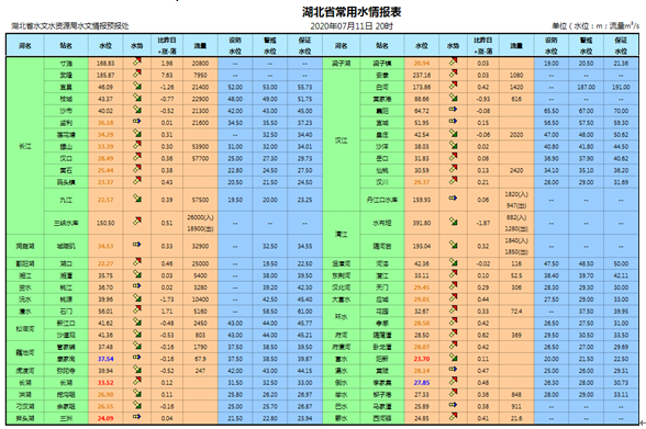 2、汉江:今日20时,丹江口水库水位159.93米(汛限水位160.00米),入库流量1820立方米每秒,下泄流量947立方米每秒(黄家港站)。汉江中下游干流黄家港至汉川站水位有涨有落,最大涨幅0.21米(汉川站),最大落幅0.93米(黄家港站)。汉川站水位29.37米,超警戒0.37米,其余各站均在设防以下。
